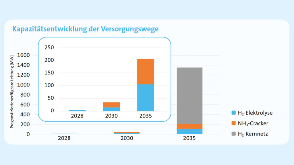 Die nächste wichtige Marke auf dem Weg in die Wasserstoff-Zukunft ist der Aufbau eines ersten Ammoniak-Crackers im Hafen Neuss bis 2030. Ammoniak wird dann per Schiff angeliefert und mit dem Cracker in seine Bestandteile Stickstoff und Wasserstoff zerlegt, sodass diese weiter genutzt werden können. Mögliche jährliche Wasserstoff-Verfügbarkeit: 60.000 Tonnen. Das dritte Standbein wird laut Thomas Kattenstein das Wasserstoff-Kernnetz sein, an das der Kreis angeschlossen wird. Ab 2035 können so 300.000 Tonnen pro Jahr angeliefert werden.