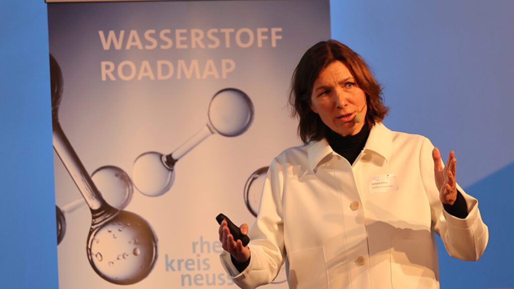 Stefanie Peters, Geschäftsführerin des Familienunternehmens Neuman & Esser und Mitglied des Nationalen Wasserstoffrats, gratulierte dem Rhein-Kreis Neuss zu den Ergebnissen der Roadmap. „Hier gibt es Meilensteine. Wir brauchen genau diese konkreten Projekte.“ Wie die anderen Rednerinnen und Redner an diesem Abend in Neuss forderte sie alle Anwesenden dazu auf, sich schon jetzt auf den Weg zu machen. „Wir müssen ins Machen kommen. Projekte für das Jahr 2030 müssen jetzt beginnen. Deswegen sollten wir nicht warten, bis das Kernnetz kommt. Wir müssen jetzt mit der Produktion beginnen.“