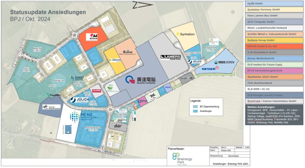 „30 Prozent sind reserviert, zehn sind noch frei.“ Der aktuelle Plan ist der Grafik zu entnehmen. Sehr weit ist der Neubau der Hans Lamers Bau GmbH sowie direkt daneben im Norden die Synhelion Germany GmbH. Begonnen haben die Bauvorbereitungen für die Niederlassung von Quanta Computer. Unter anderem. Der Konzern plant im Brainergy Park Jülich die Produktion hochpräziser elektronischer Anlagen und Geräte für namhafte OEMs (Original Equipment Manufacturers, also Zulieferer) und Fahrzeughersteller, insbesondere im Bereich autonomes Fahren.