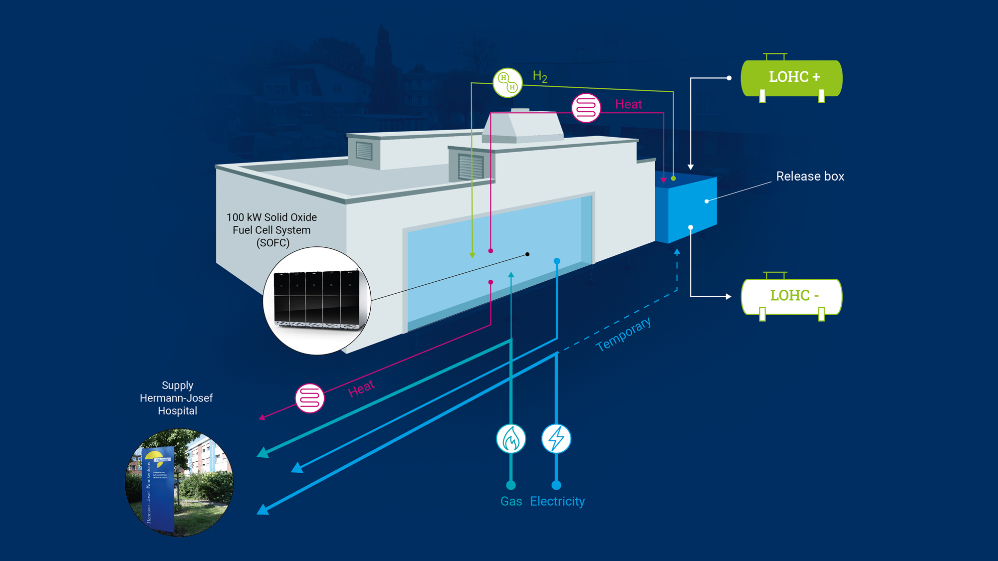 Die Robert Bosch GmbH, die Hydrogenious LOHC NRW GmbH, das Hermann-Josef-Krankenhaus Erkelenz und das Helmholtz-Wasserstoffcluster wollen zeigen, dass die neue Kombination der beiden Wasserstofftechnologien 20 Prozent des Strom- und Wärmebedarfs des Erkelenzer Krankenhauses decken kann. Dies ist eine relevante Größenordnung, die eine Skalierung der Technologie für größere Bedarfe und andere Anwendungen ermöglicht.