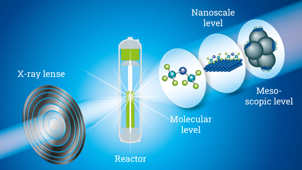 “There is no better method for our purposes,’ says Hans-Georg Steinrück. This is why he is currently planning to set up an X-ray laboratory in Jülich. The fact that X-rays are well suited to analysing the atomic level has to do with the wavelength of the radiation. This is approximately one Ångström, which corresponds to one ten millionth of a millimetre. One angstrom is also a typical size for the radius of an atom. X-rays therefore have exactly the right wavelength to recognise when something changes at the atomic level. Either because the position of an atom or molecule has changed or because a molecule or catalyst particle has broken apart.
