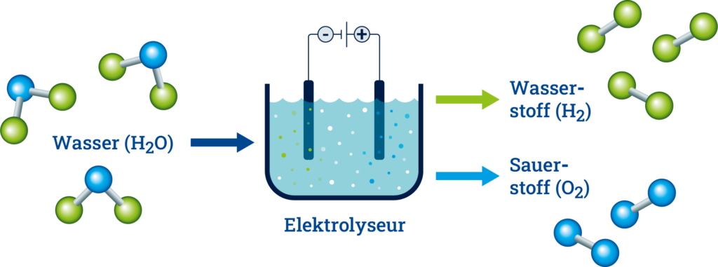 Die Ausgangsbasis ist meistens Wasser (H2O), das aus Wasserstoff (H2) und Sauerstoff (O2) besteht. Wer Wasser in seine Bestandteile Wasserstoff und Sauerstoff aufspalten will, muss Energie aufwenden. Das Verfahren der Trennung ist vor allem die Elektrolyse. Wichtig ist, dass die Energie für die Elektrolyse aus regenerativen Quellen wie Sonnen-, Wind- oder Wasserenergie kommt.