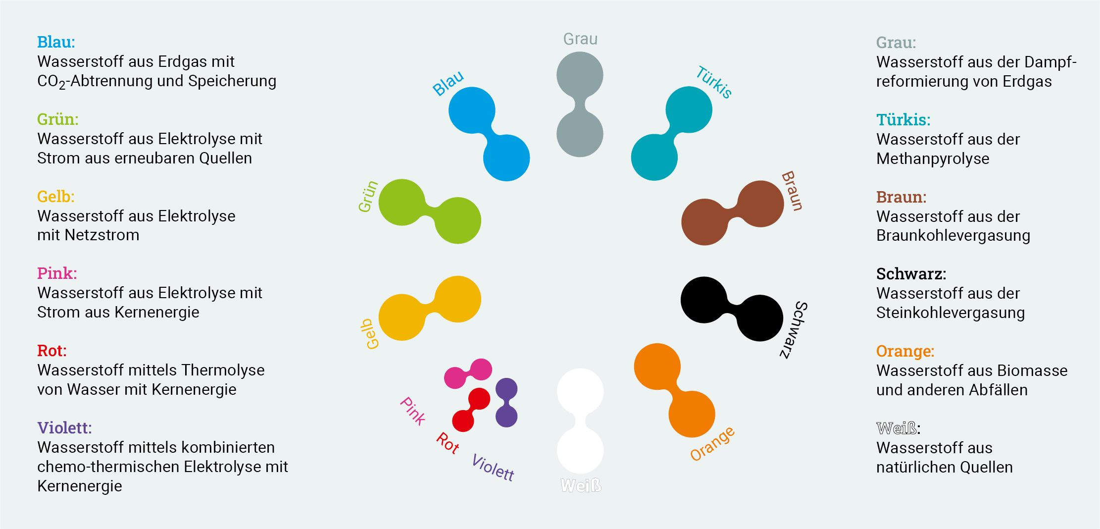 Eine ultimative Antwort auf die Zahl in der Farbenlehre gibt es nicht. Das liegt beispielsweise daran, dass grauer Wasserstoff oft noch einmal unterschieden wird in Bezug auf den ursprünglichen Energieträger. Stammt der Wasserstoff aus einer Braunkohlevergasung, dann sprechen wir von braunem Wasserstoff, stammt er aus einer Steinkohlevergasung, dann ist von schwarzem Wasserstoff die Rede. Auch gibt es eine Definition für grauen Wasserstoff im engeren Sinne: nämlich dann, wenn er aus fossilem Erdgas gewonnen wird. In der Serie „Die Farben des Wasserstoffs“ versuchen wir uns an einer Farbenlehre. Wir haben keinesfalls den Anspruch, das Thema damit in Stein gemeißelt zu haben.