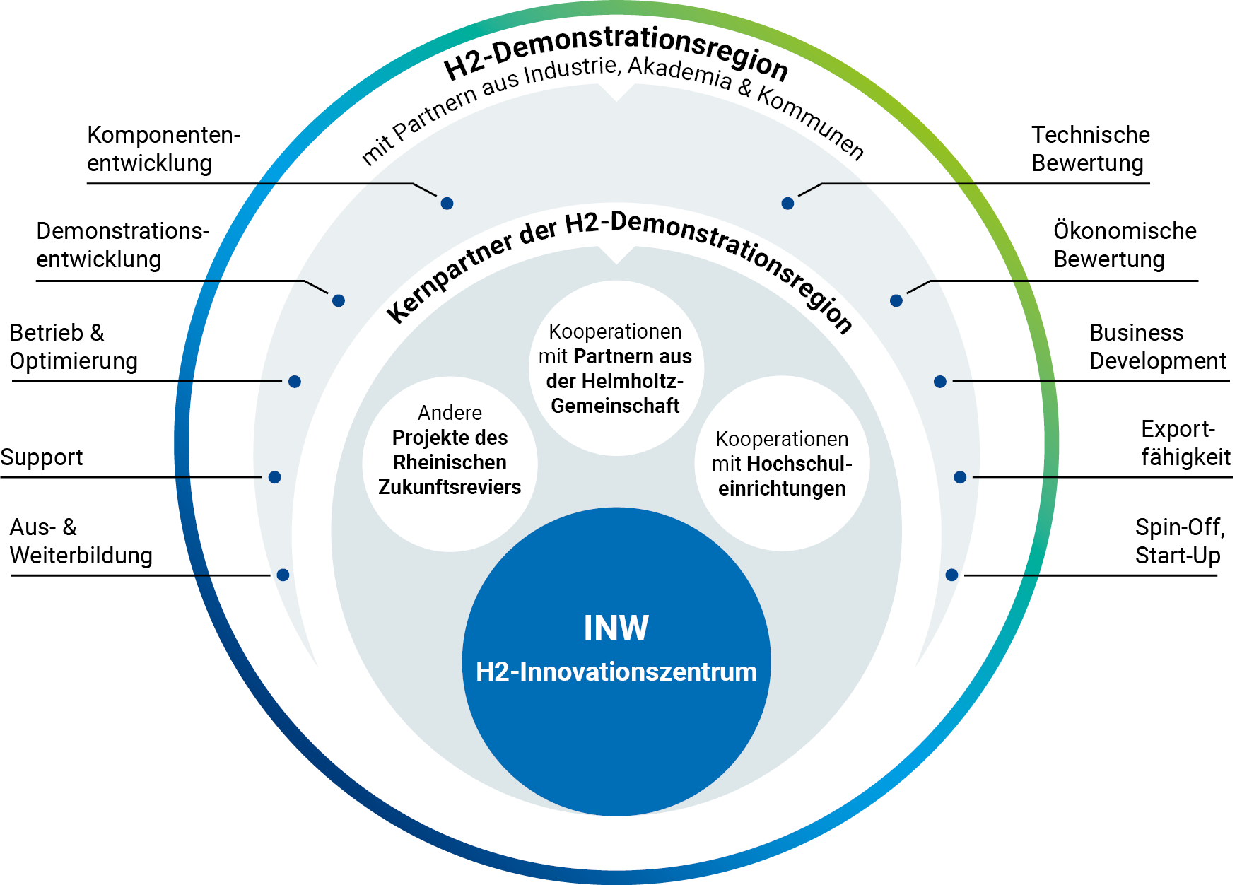 Mit den Fördergeldern werden auch die Demonstrationsprojekte betreut, die im gesamten Rheinischen Revier geplant sind. Die Zusammenarbeit des INW mit Partnern aus Forschung, Industrie und Wirtschaft findet unter dem Dach des HC-H2 statt. Hier wollen die Partner im Industriemaßstab zeigen, dass die neuen innovativen Wasserstoff-Technologien den erhofften Beitrag zum Klimaschutz leisten und gleichzeitig wirtschaftlich lukrativ sind.  Der Aufbau und der Betrieb der Demonstrationsvorhaben sollen für neue Arbeitsplätze sorgen. Das ist der zweite große Verwendungszweck der Fördergelder. Mit den erfolgreichen Demonstrationsvorhaben soll das Rheinische Revier zu einem weltweit sichtbaren Leuchtturm werden, mit Technologien, die anschließend überall auf der Welt einen Beitrag zur klimaschonenden Energiewirtschaft der Zukunft leisten.