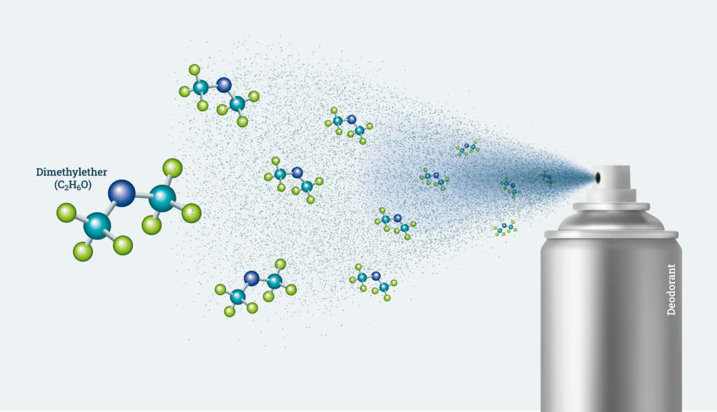 Dimethylether ist ein handelsüblicher Träger für Deodorants in Sprühflaschen. Grafik: Forschungszentrum Jülich/Reisen