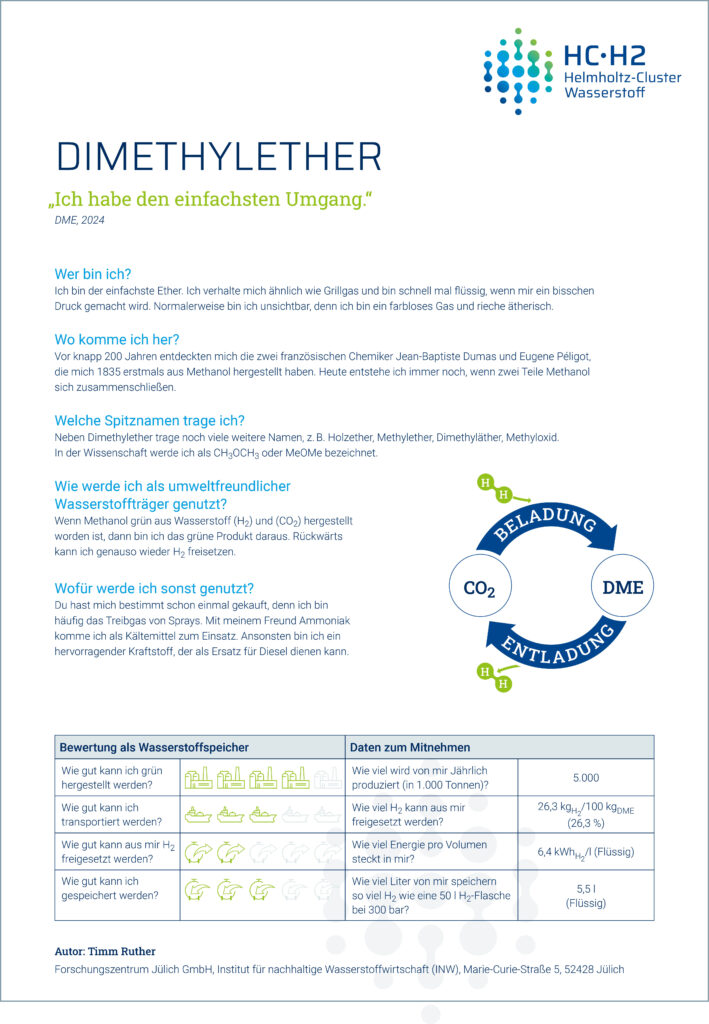 Das INW konzentriert sich wie gesagt auf chemische Speichermethoden unter anderem, weil der Energieaufwand für das Speichern meistens niedriger ist als bei physikalischen Methoden. Aber auch die chemischen Speicher stellen Ansprüche. In dieser Serie stellen wir die chemischen Speicher, die unsere Forscherinnen und Forscher beschäftigen, mit Steckbriefen vor. Den Auftakt mach Dimethylether, kurz DME, das viele als den Trägerstoff in Sprühdeos kennen. In der Flasche unter geringem Druck ist es flüssig. Wird der Sprühkopf gedrückt, entweicht DME als Gas und transportiert den Duftstoff an die gewünschte Stelle.