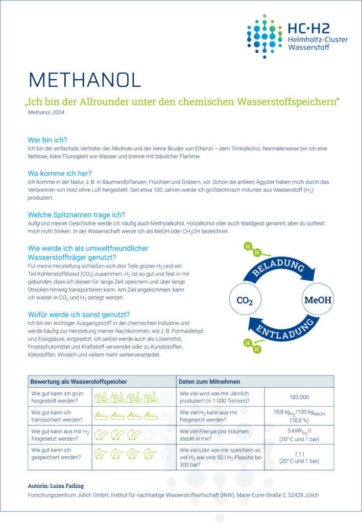 Das INW konzentriert sich wie gesagt auf chemische Speichermethoden unter anderem, weil der Energieaufwand für das Speichern meistens niedriger ist als bei physikalischen Methoden. Aber auch die chemischen Speicher stellen Ansprüche. In dieser Serie stellen wir die chemischen Speicher, die unsere Forscherinnen und Forscher beschäftigen, mit Steckbriefen vor. Diesmal stellen wir Methanol vor.