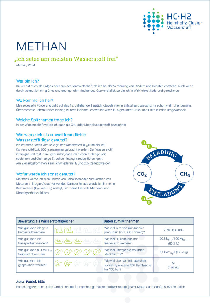 Das INW konzentriert sich wie gesagt auf chemische Speichermethoden unter anderem, weil der Energieaufwand für das Speichern meistens niedriger ist als bei physikalischen Methoden. Aber auch die chemischen Speicher stellen Ansprüche. In dieser Serie stellen wir die chemischen Speicher, die unsere Forscherinnen und Forscher beschäftigen, mit Steckbriefen vor. Diesmal stellen wir Methan vor.