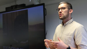 Teamleiter Fabian Patzak (l.) sowie die Referent:innen Vanessa Düster (m.) und Severin Foit (r.) sind die Kontaktstelle des HC-H2. Das Team-Netzwerk fungiert als Dienstleister und gibt Unternehmen, Kommunen und interessiertem Fachpersonal die Möglichkeit, sich und ihre Expertise in eine vom Netzwerk-Team aufgebaute Datenbank aufnehmen zu lassen. Damit unterstützt das Netzwerk die Mitglieder bei der Suche nach potenziellen Kooperationspartner:innen und ermöglicht so die Umsetzung von Projekten.