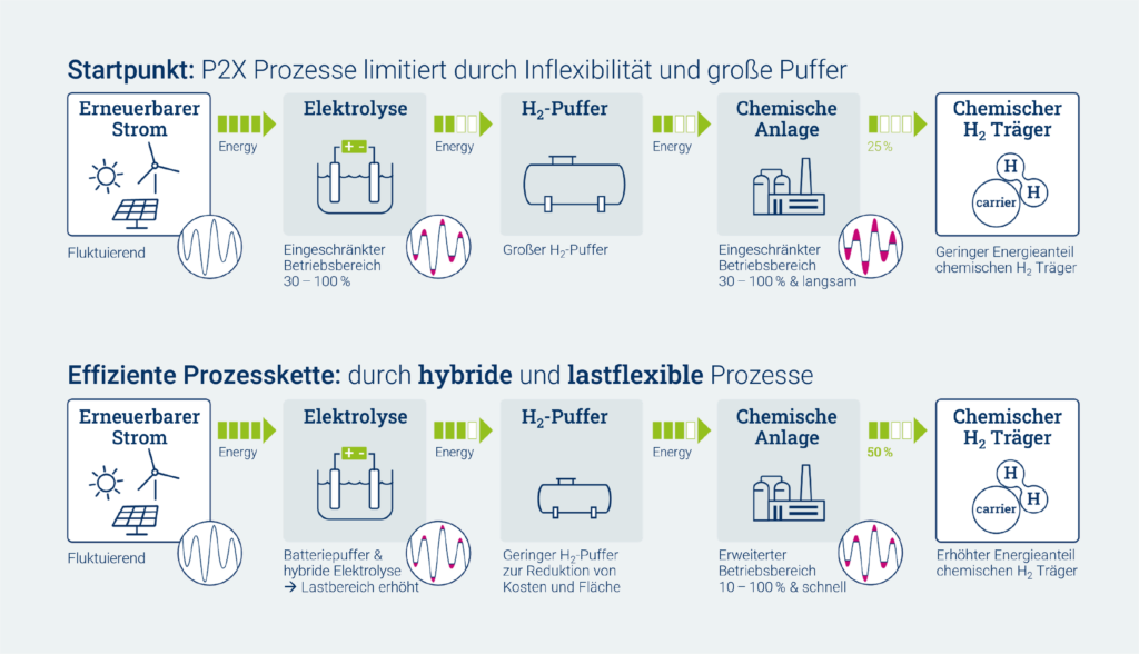 Die Grafik veranschaulicht den Unterschied zwischen einer Ammoniak-Synthese mit großem Pufferspeicher (oben) und einer Ammoniak-Synthese mit lastflexibleren Reaktor (unten). Grafik: Forschungszentrum Jülich/Reisen