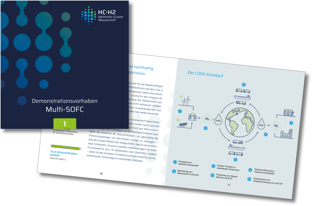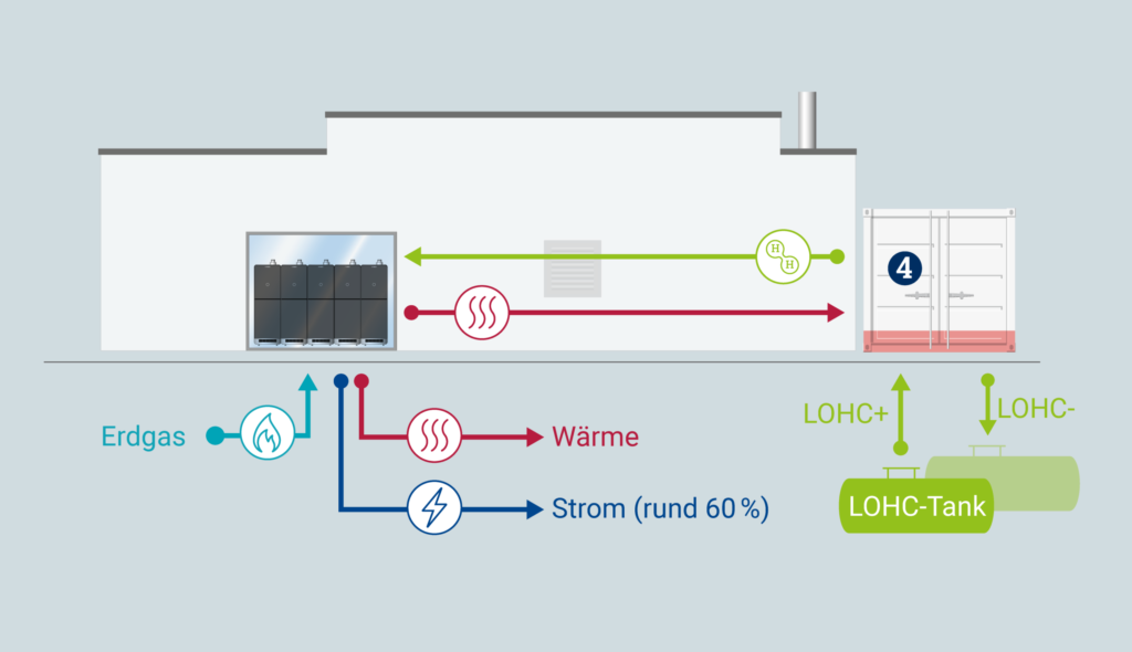 Im nächsten Schritt löst die LOHC-Technologie die Gasflaschen ab. Bis dahin hat die Hydrogenious LOHC NRW GmbH am HJK ihre Infrastruktur installiert. Diese ermöglicht, Wasserstoff in einem herkömmlichem Tank-Lkw bei Umgebungsbedingungen in Erkelenz anzuliefern. Um den Wasserstoff aus dem LOHC freizusetzen, muss dem Thermalöl Energie in Form von Wärme zugeführt werden. Die Partner wollen zeigen, dass es möglich ist, dafür die Abwärme zu nutzen, die das SOFC-System beim Verstromen des Gasgemischs erzeugt.